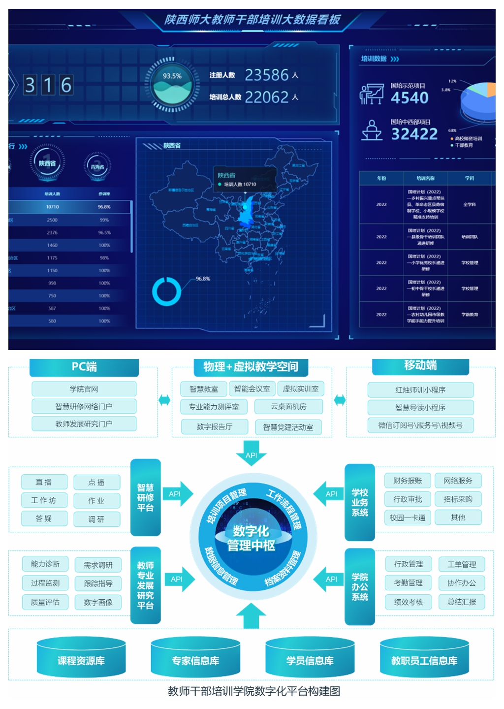 智能工具:学院建设了“陕西师大教师智慧研修平台”、“教师专业发展研究平台”、“红烛师训”助手、312智慧学伴、教师智慧导读小程序等智能教学工具,通过对训前、训中、训后全过程数据采集,实现精准调研、精准教学、精准评价、精准指导,促进培训提质增效。
