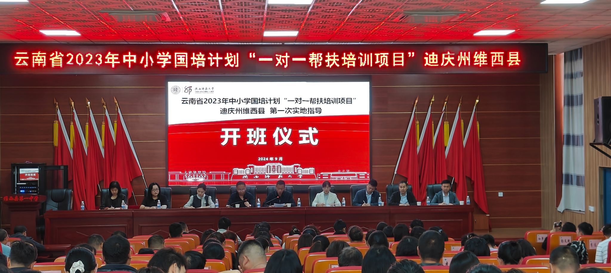 承办的云南省2023年中小学国培计划“一对一帮扶培训项目”(迪庆州维西县)第一次实地指导研修活动顺利进行。陕西省中小学6位专家,维西县教育体育局副局长马玉玺,县教师发展中心主任陈李祥以及近200名教师参加了开班仪式。开班仪式由陈李祥主持。